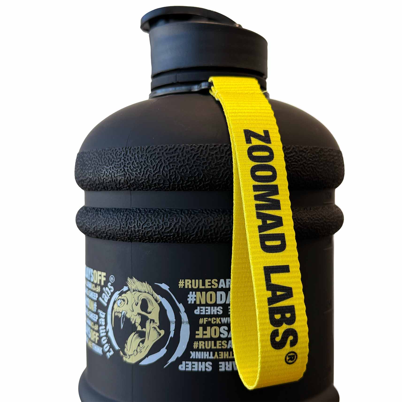 El shaker Zoomadlabs, con 2,2 litros de capacidad, es tu compañero ideal para hidratarte durante tus entrenos más bestias. Con una correa duradera para facilitar el transporte junto con una ergonómica asa